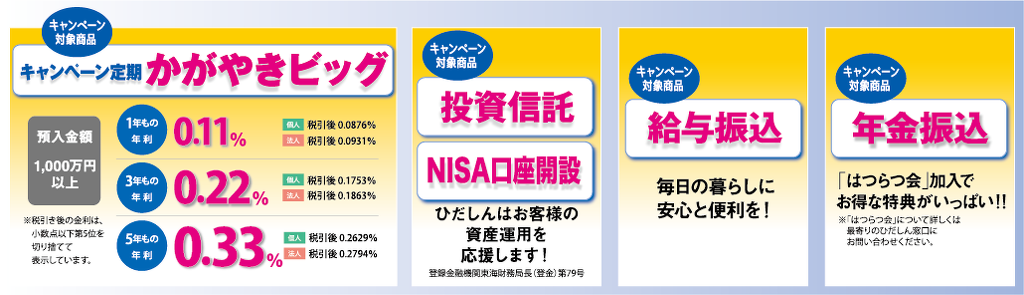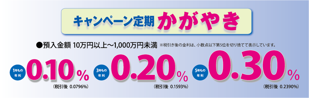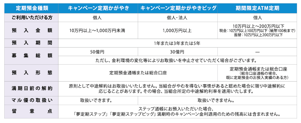 キャンペーン定期「かがやきビッグ」の概要はページ下部「定期預金概要」をご覧ください。