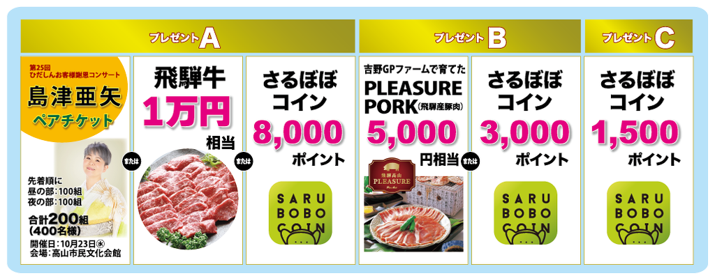 - 複数の抽選権を「コンサートペアチケット昼」「コンサートペアチケット夜」「さるぼぼコイン」それぞれ分けて申込いただけます。※重複当選はございません。
