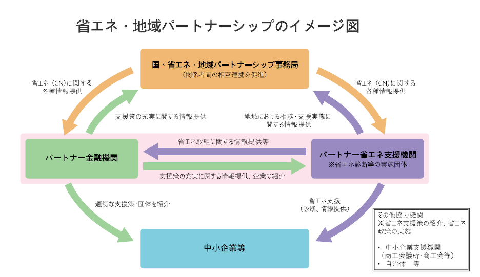 資源エネルギー庁及び省エネ・地域パートナーシップ事務局と中小企業等の身近な相談先であるパートナー機関等との間で、省エネ政策・取組等に関する各種情報の提供や交換を行いながら、中小企業等の省エネを地域で支える取組であり、パートナー金融機関の支援を受けた中小企業等が省エネ補助金に申請する際に優遇を受けられるものとなります。