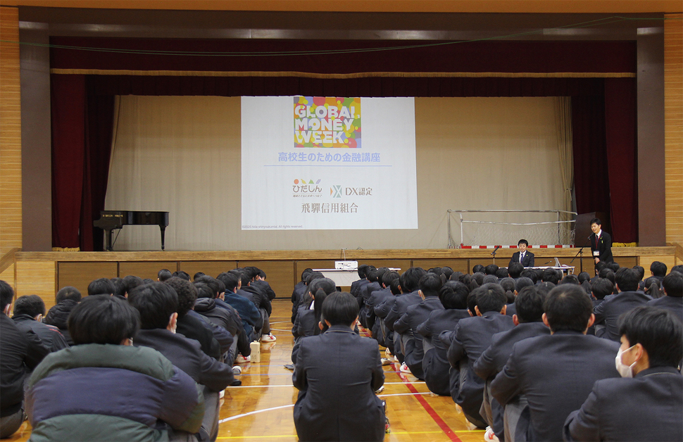 「金融教育に関する国際ネットワーク」が主催する、こども・若者に対する金融教育・金融包摂の推進のための国際的な啓発活動(グローバル・マネー・ウィーク)に賛同し、令和7年3月3日(月)、高山西高等学校の2年生(約130名)へ、「高校生のための金融教室」を開催しました。