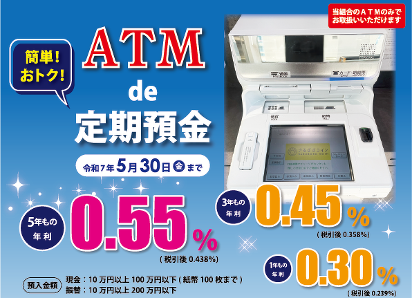 令和7年5月30日(金)まで、当組合のATMにて定期預金を特別金利でお預けいただけます!