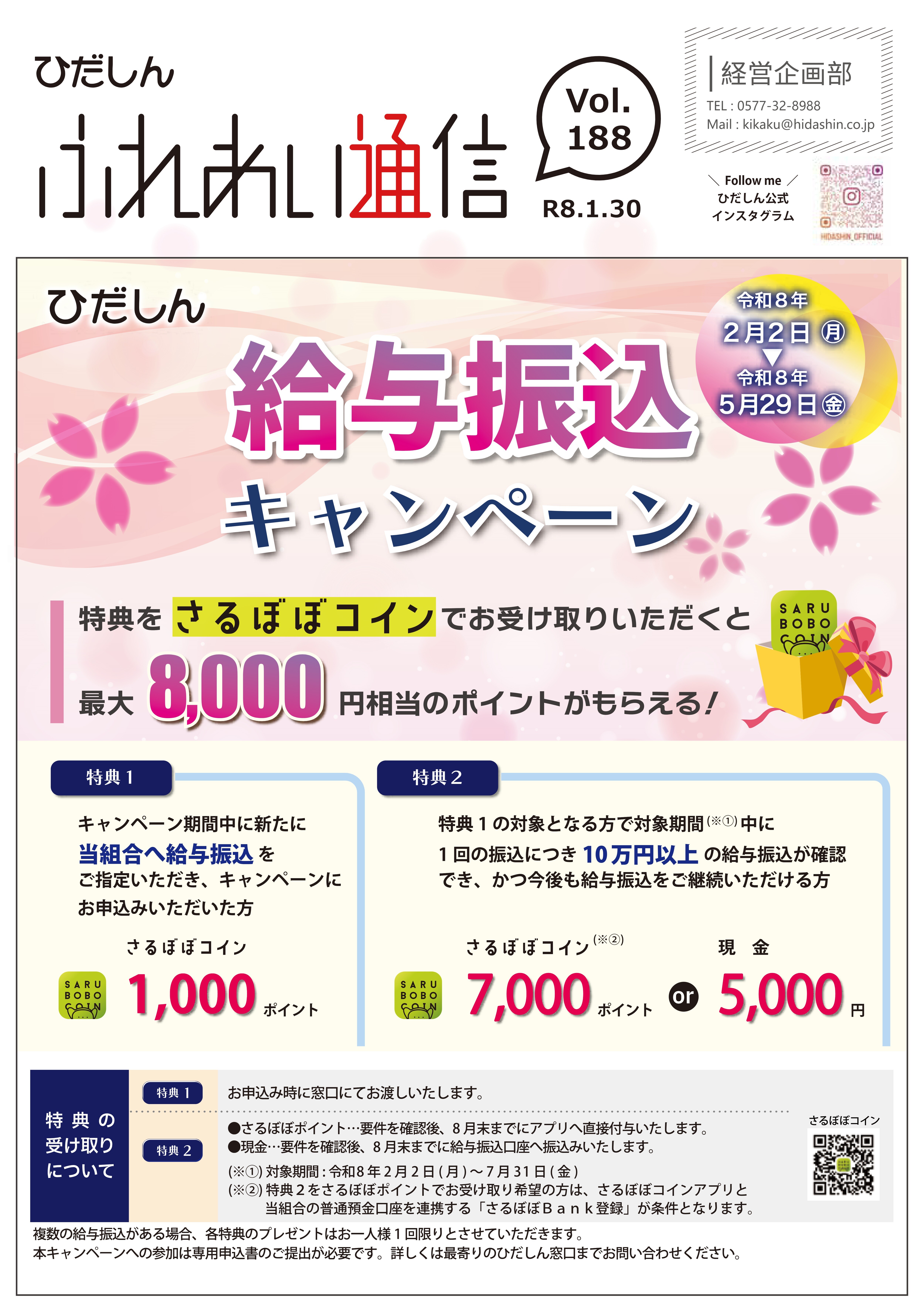 ふれあい通信 ひだしんの“今”をお伝えする、機関紙『ふれあい通信』を発行し、旬な情報をお届けいたします。 最新号vol.188(2026年1月30日発行) バックナンバー 2025年 vol.176(1/31) vol.177(2/26) vol.178(3/27) vol.179(4/30) vol.180(5/28) vol.181(6/30) vol.182(7/30) vol.183(8/29) vol.184(9/30) vol.185(10/31) vol.186(11/28) vol.187(12/29) 2024年 vol.164(1/25) vol.165(2/26) vol.166(3/27) vol.167(4/25) vol.168(5/28) vol.169(6/27) vol.170(7/30) vol.171(8/26) vol.172(9/27) vol.173(10/31) vol.174(11/29) vol.175(12/27) 2023年 vol.152(1/30) vol.153(2/27) vol.154(3/28) vol.155(4/25) vol.156(5/30) vol.157(6/27) vol.158(7/26) vol.159(8/29) vol.160(9/27) vol.161(10/30) vol.162(11/27) vol.163(12/28) 2022年 vol.140(1/25) vol.141(2/25) vol.142(3/25) vol.143(4/26) vol.144(5/30) vol.145(6/27) vol.146(7/27) vol.147(8/26) vol.148(9/28) vol.149(10/25) vol.150(11/28) vol.151(12/26)