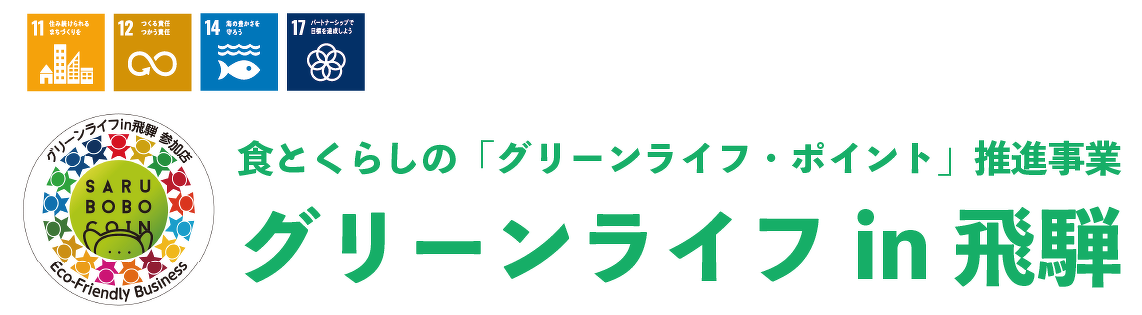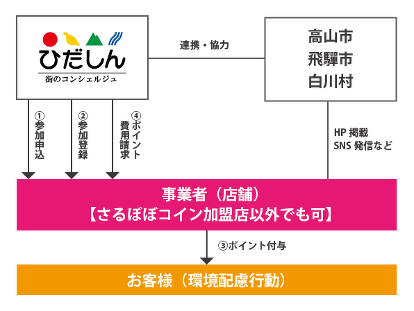 この事業は、お客様が「グリンーンライフin飛騨」の参加店舗で、店舗が提供する環境に配慮したサービスや、CO2削減などに繋がる行動にご協力いただいた場合等に、店舗がお客様にさるぼぼポイントを提供します。