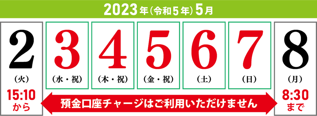 5月2日(火)23:40から5月7日(日)23:59にかけて、預金口座チャージが休止する旨ご案内しておりましたが、システム更改の日程が急遽変更となり、本日(5/2)15:10頃より預金口座チャージが休止しております。