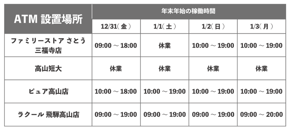 ※高山短大ATMにつきましては、12月29日(木)~1月3日(月)まで休業しております。