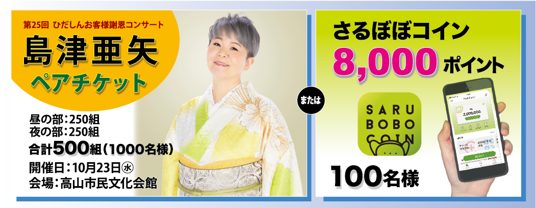 - 複数の抽選権を「コンサートペアチケット昼」「コンサートペアチケット夜」「さるぼぼコイン」それぞれ分けて申込いただけます。※重複当選はございません。