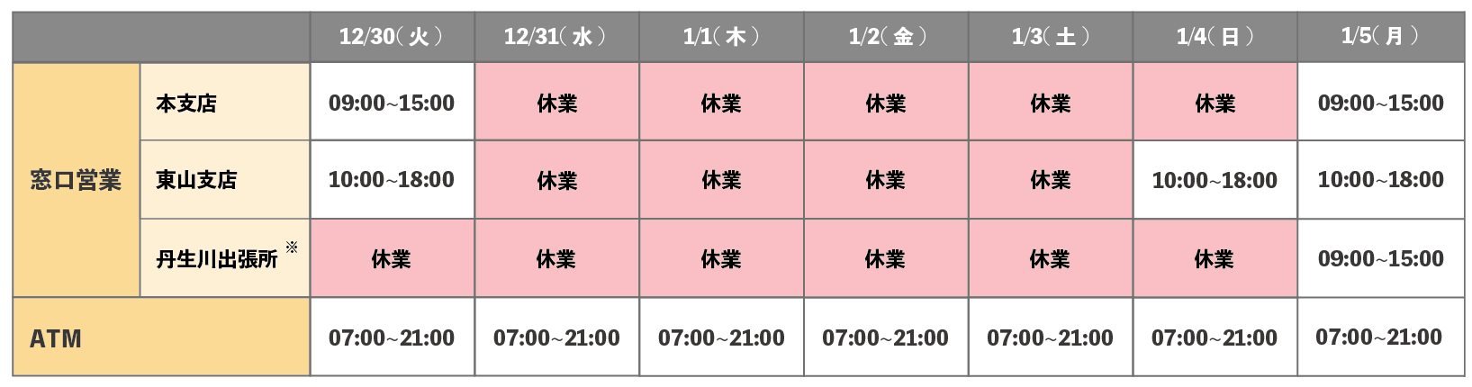 なお、以下の店外ATMにつきましては、年末年始の稼働時間が通常と異なりますのでご注意ください。
