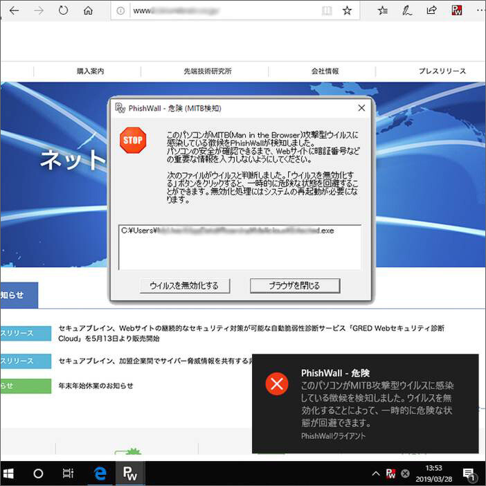 不正なポップアップで情報を盗む攻撃-MITB(マン・イン・ザ・ブラウザ)攻撃を検知した場合