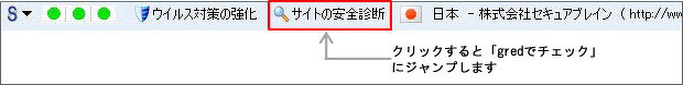 ウェブサイトを閲覧時に不審に感じたら、「サイトの安全診断」をチェックすることで、セキュアブレインが提供する個人向け無料ウェブセキュリティサービス「gredでチェック」のウェブ解析ページにジャンプします。「サイトの安全診断」をクリックすると、「gredでチェック」の画面が開かれた時点で、閲覧中のサイトのURLが既に入力されます。
