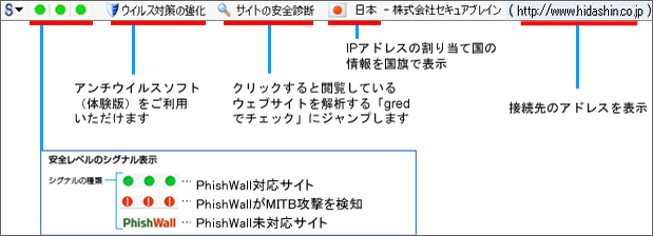 ほかのセキュリティ製品とも一緒に使えます。インストールするとInternetExplorerにツールバーとして表示され、PhishWall導入企業のウェブサイトにアクセスすると、ツールバー上に緑の信号を点灯し、真正なサイトであることを証明します。
