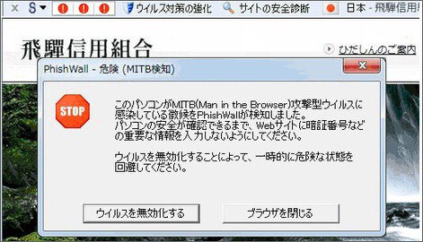 飛騨信用組合のサイトにアクセスするタイミングで、お客様のPCがMITB攻撃型ウイルスに感染していないかをチェックし、感染の兆候を発見した場合に、警告画面で情報の入力をブロックします。またウイルスを無効化する機能が搭載されています。
